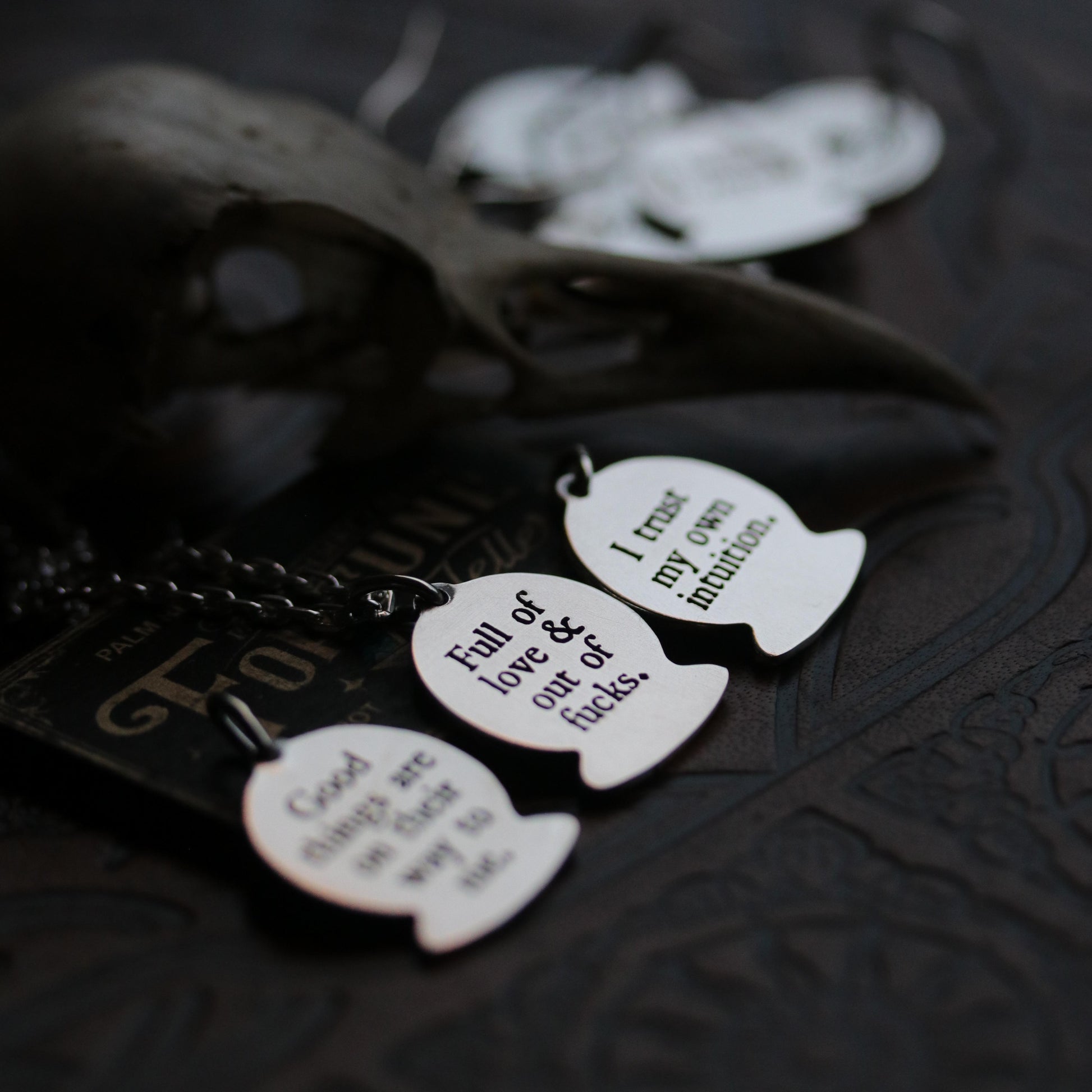 I designed these charms so that spirit will guide the right message to you, each charm will be sent at random so you will have no idea what your message will be until you open the parcel. However if you are certain that you want your own few words then please choose the custom option and tell me your few words that you'd like engraving on the back.
