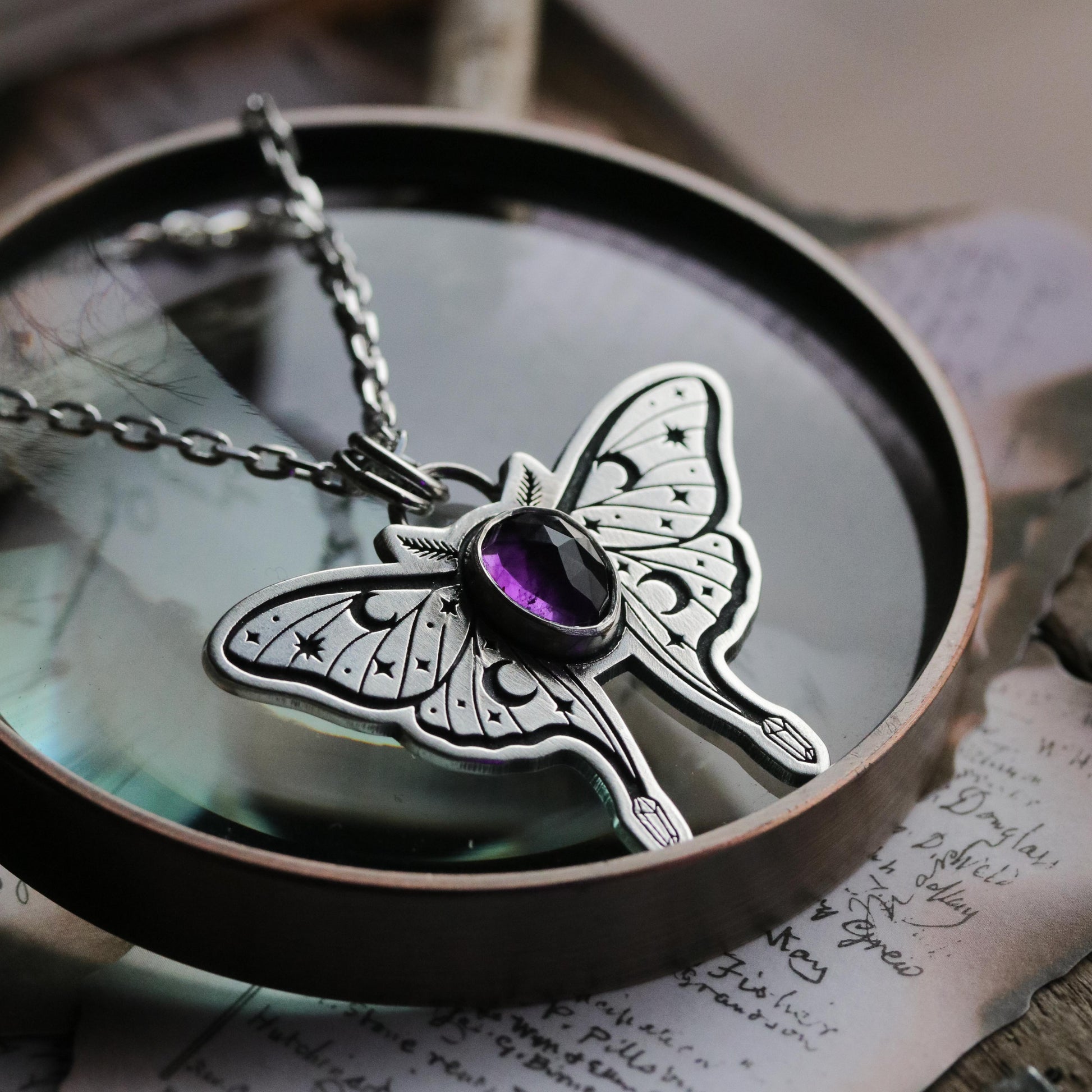 Sterling silver Luna Moth pendant with Amethyst gemstone.