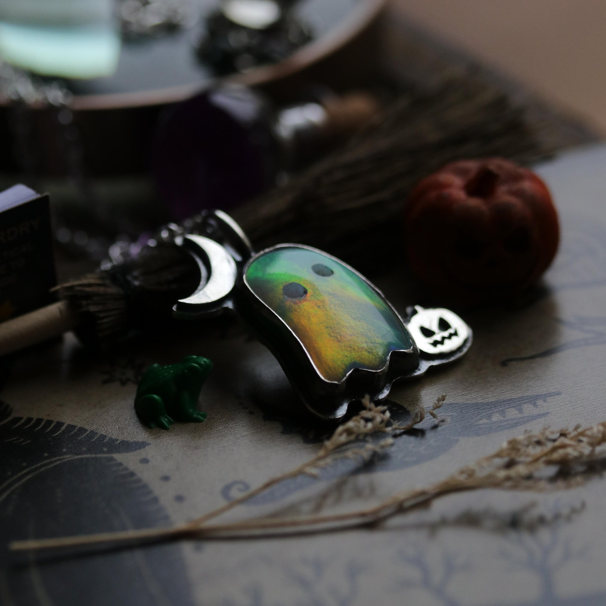 This pastel boo has been created using a lab grown, synthetic opal and I have hand forged a little silver, textured jacket to surround the stone with a moon crescent & pumpkin companion.