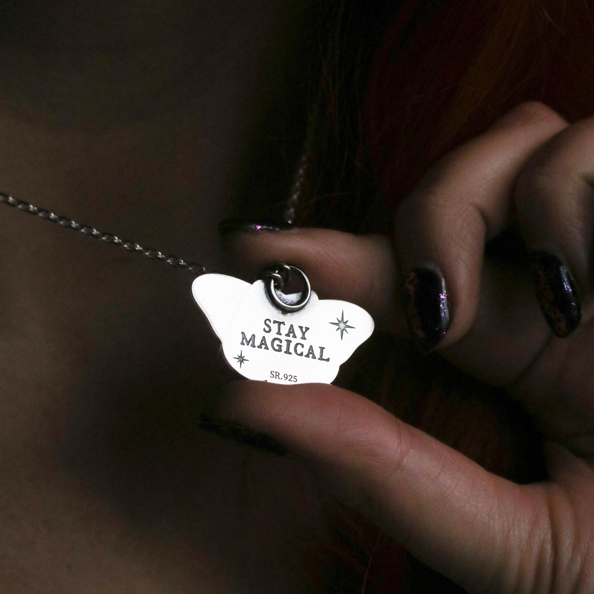 Sterling silver Luna Moth pendant with "Stay Magical" engraving on the reverse.